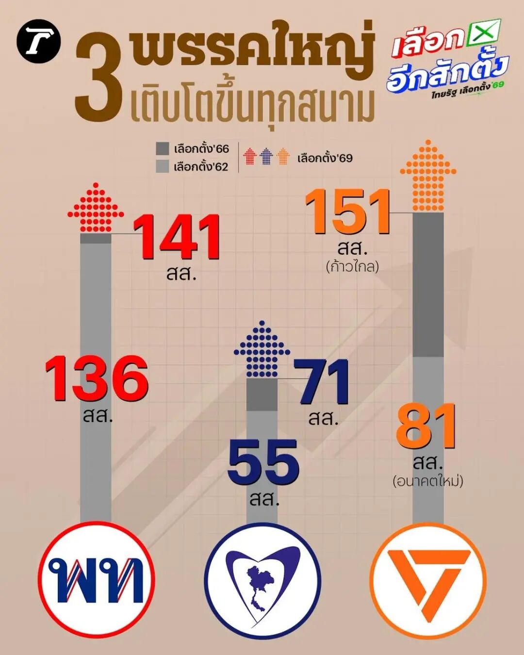 为泰党在2019年大选中位列第一,议席较上届增加5席,虽然增幅不算突出,但体现出其核心支持群体与传统票仓仍保持稳定,组织体系与基层动员能力依旧具备韧性。