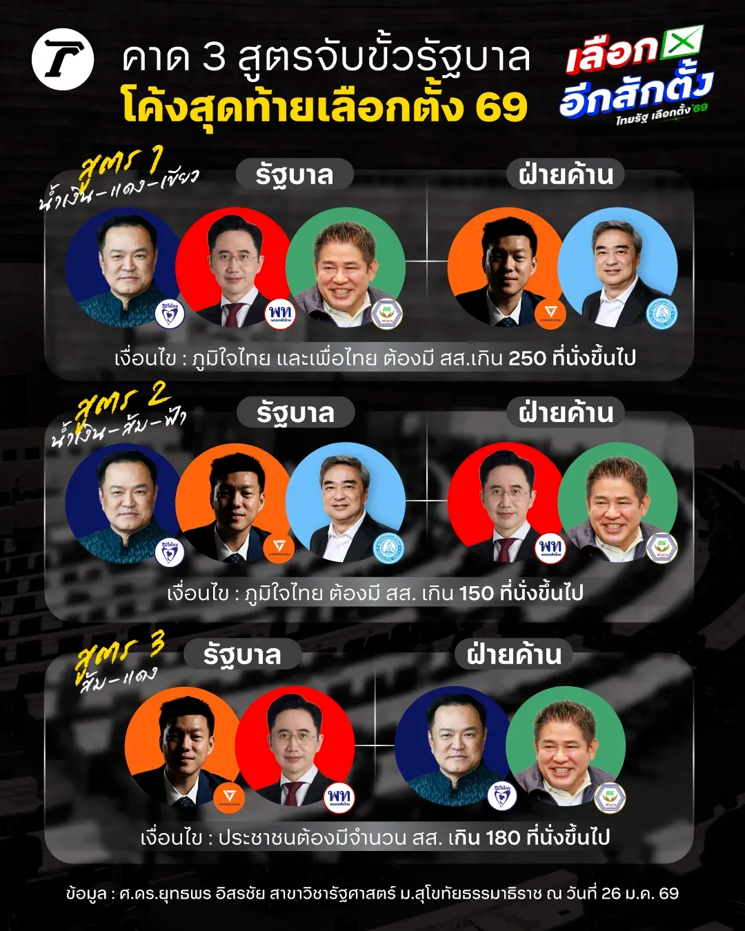 方案一:由泰自豪党、为泰党与勇敢道德党组成执政联盟,并吸纳部分中小政党补足多数席位;人民党与民主党转入在野阵营。