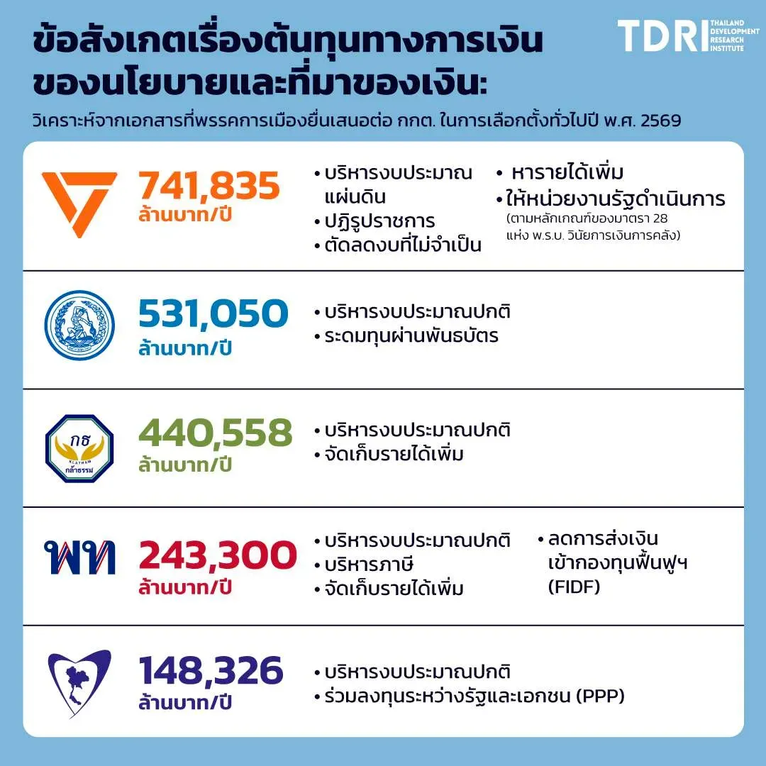 泰国发展研究院(TDRI)对最有可能参与执政的五大政党进行了财政评估,认为各党政策普遍偏向补贴型、刺激型支出、社会福利体系设计仍不够系统、财政纪律与长期资金来源说明不足。