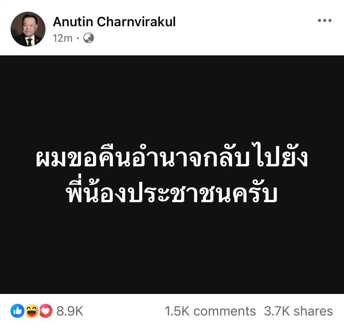 泰国总理阿努廷于12月11日晚在社交媒体上发布声明表示:“我请求将权力交还予人民。”泰国媒体报道称,这一声明表明阿努廷已向哇集拉隆功国王提请解散国会下议院,以推动提前举行大选。
