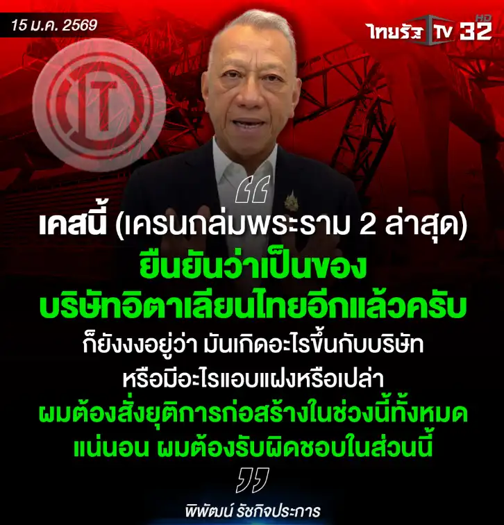事故发生后,泰国副总理兼交通部长皮帕接受采访,确认这起起重机坍塌事故,同样出自意大利-泰国发展公共有限公司承建的项目。