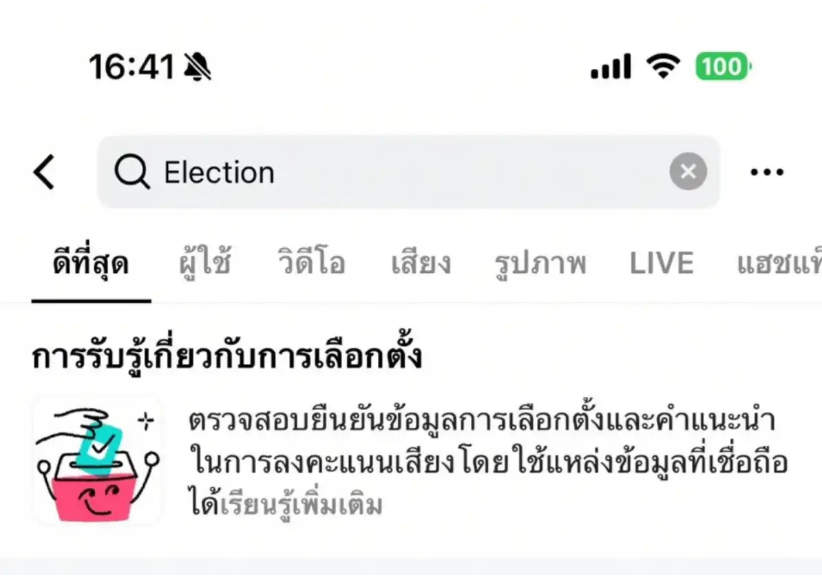 TikTok东南亚公共政策总监差妮达表示,从1月16日起,平台将正式上线“选举信息中心”。想知道什么时候投票、去哪投、怎么投、候选人有没有资格?不用刷八卦,不用信小道消息,直接搜“选举”就能看到官方信息,全部来自泰国选举委员会。