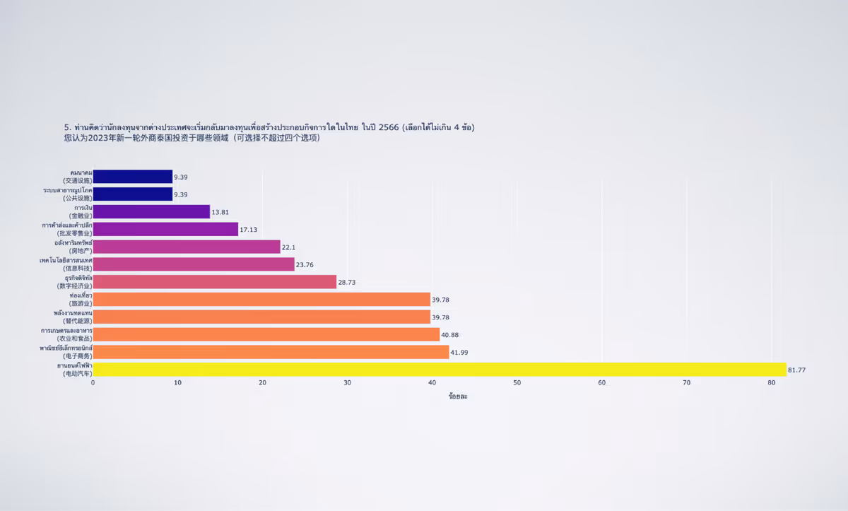 外国投资方面,几乎所有受访者都认为,外国投资者对泰国电动汽车产业最感兴趣,其次是电子商务、农业和食品、可再生能源和旅游业。