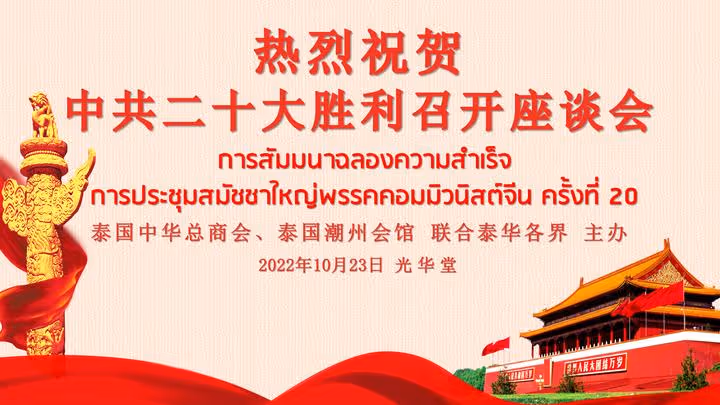 中國共產黨第二十次全國代表大會剛剛圓滿閉幕之際,泰國中華總商會、泰國潮州會館聯合泰華各界,第一時間對中共二十大勝利召開表達祝賀,於2022年10月23日下午,在中總光華堂隆重舉辦“熱烈祝賀中共二十大勝利召開”座談會,暢談感受、交流心聲,泰國中華總商會暨各行業公會聯誼會、各商協會首長,泰國潮州會館暨九屬十同鄉會首長、泰華各界僑領、代表二百多位出席座談會,場面隆重熱烈。會前,與會領導、代表共同錄製視頻,熱烈祝賀中共二十大勝利召開!