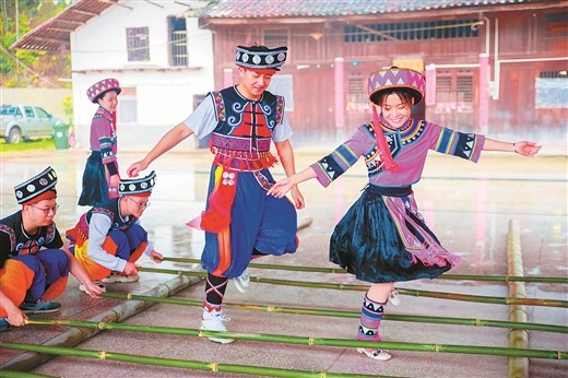 15、灵川县大境瑶族乡松江村倘竹坪屯,瑶族同胞们身穿节日盛装,开展跳竹竿、对山歌等活动,欢度“壮族三月三”。石 玲 龚炳旭/摄