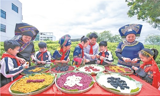 21、桂林市秀峰区解东社区群众欢聚一堂,一边包艾叶粑,一边叙民族情。陈 静/摄