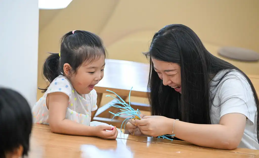 ผู้ปกครองและเด็กๆ ร่วมเรียนรู้ทักษะการสานหญ้าตงซานที่ศูนย์วัฒนธรรมมณฑลไห่หนาน (ซินหัว)