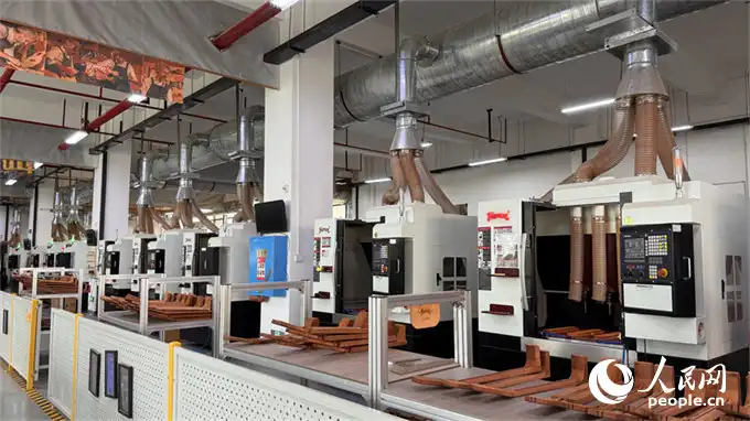 ภายในโรงงาน เครื่องจักรกำลังเหลาคอกีตาร์ซึ่งทำจากไม้มะฮอกกานีแอฟริกาด้วยความแม่นยำระดับ0.01 มิลลิเมตร ส่วนในโซนปรับเสียง ช่างผู้เชี่ยวชาญกำลังถือส้อมเสียงค่อยๆ สัมผัสสายกีตาร์และฟังความถี่การสั่นของแผงไม้แต่ละชิ้น โรงงานสมัยใหม่แห่งนี้มีสายการผลิตอัตโนมัติเต็มรูปแบบ2 สาย อัตราการผลิตอัตโนมัติสูงถึง 80% แต่ยังคงรักษาขั้นตอนการปรับเสียงด้วยมือแบบดั้งเดิมไว้