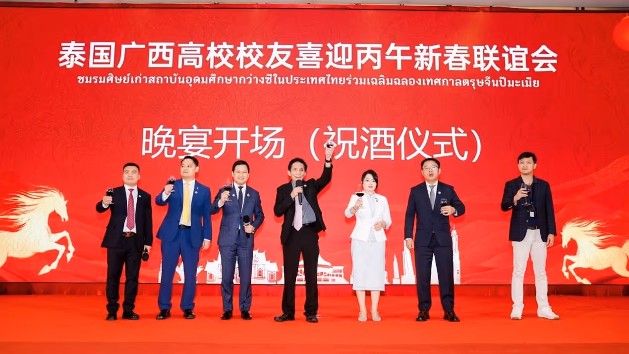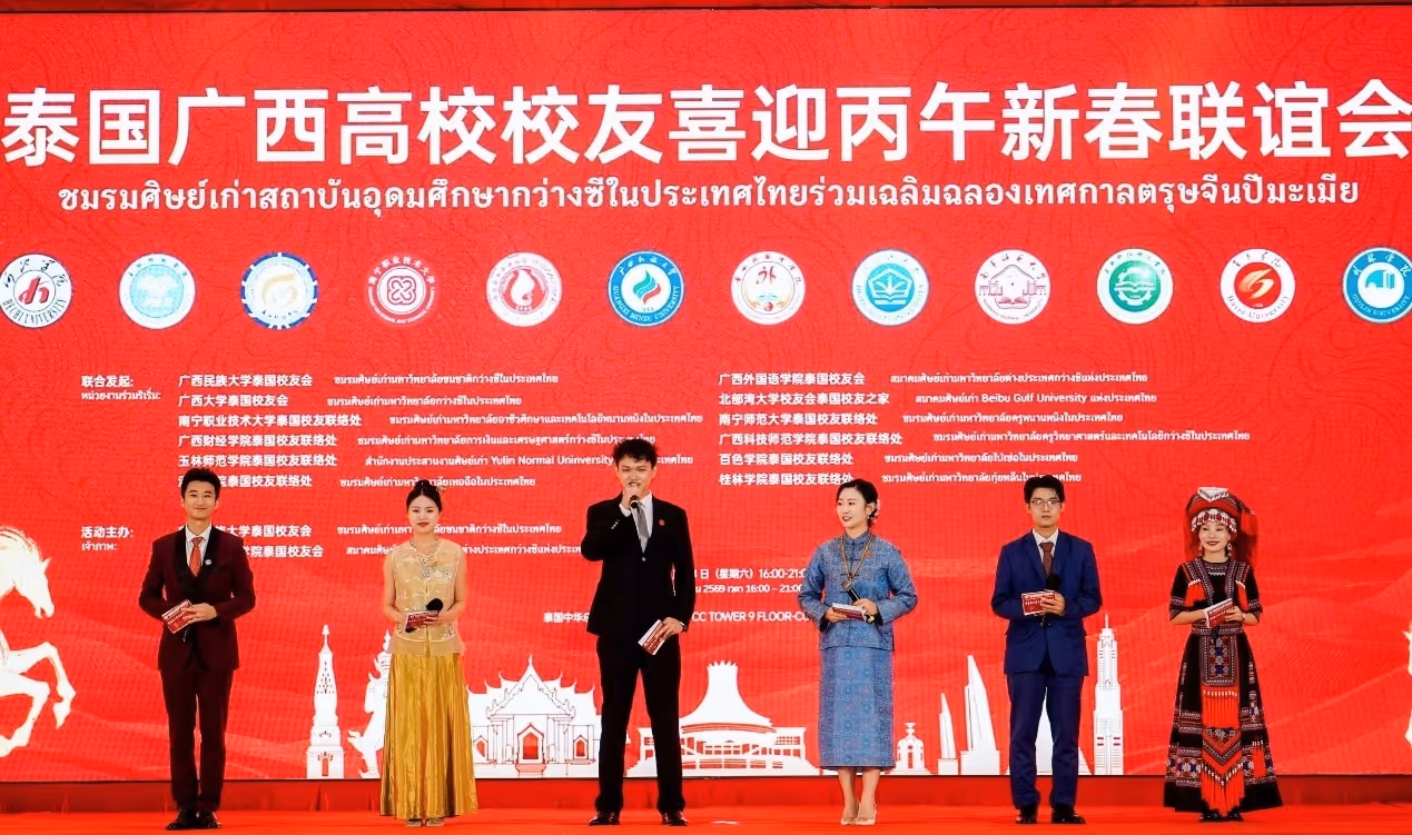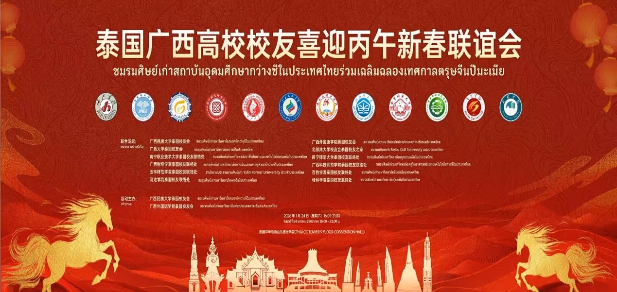 เมื่อวันที่ 24 มกราคม 2569 ณ หอประชุมกวางหวาถัง หอการค้าไทย-จีน ได้มีการจัดงานสังสรรค์ต้อนรับเทศกาลตรุษจีนปีมะเมียของชมรมศิษย์เก่าสถาบันอุดมศึกษากว่างซีในประเทศไทย ภายใต้ธีม “ม้าทะยานกว่างซี รวมพลังส่องประกายไทย-จีน” ท่ามกลางบรรยากาศอบอุ่นและคึกคัก