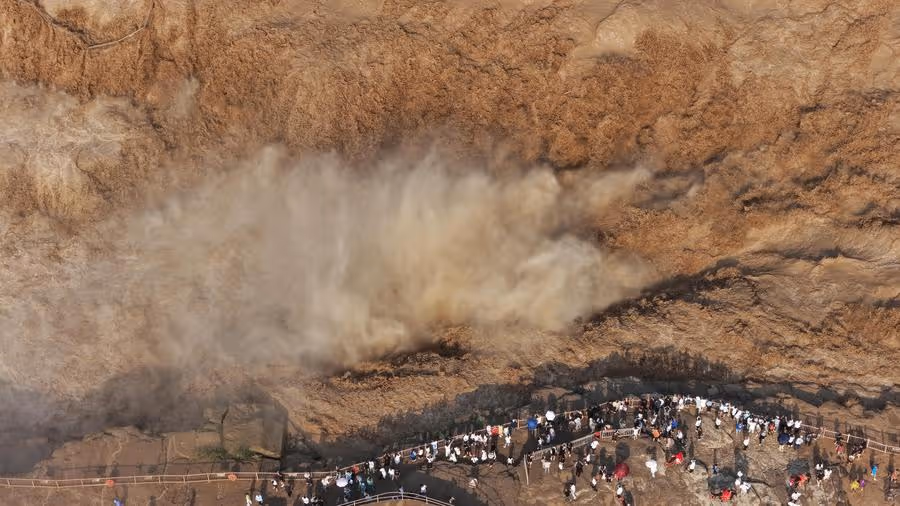 จี๋เซี่ยน, 28 ก.ค. (ซินหัว) —นักท่องเที่ยวเยี่ยมชมน้ำตกหูโข่วกลางแม่น้ำเหลืองในอำเภอจี๋เซี่ยนมณฑลซานซีทางตอนเหนือของจีนซึ่งมีกระแสน้ำสีน้ำตาลหลั่งไหลเชี่ยวกรากอย่างรุนแรงดูทรงพลังตามปริมาณน้ำที่เพิ่มขึ้นอย่างต่อเนื่องในช่วงไม่นานนี้