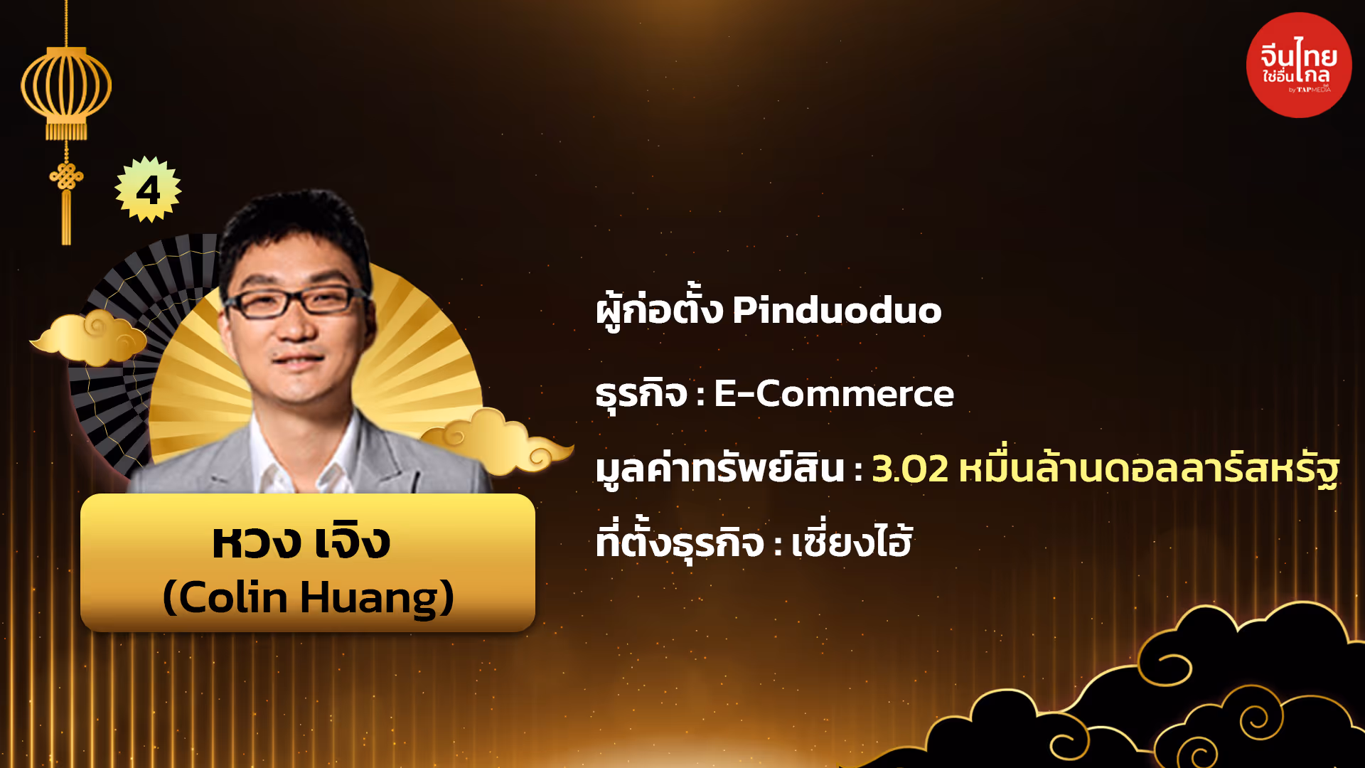 ผู้ก่อตั้ง Pinduoduo | ธุรกิจ : E-Commerce |มูลค่าทรัพย์สิน: 3.02 หมื่นล้านดอลลาร์สหรัฐ