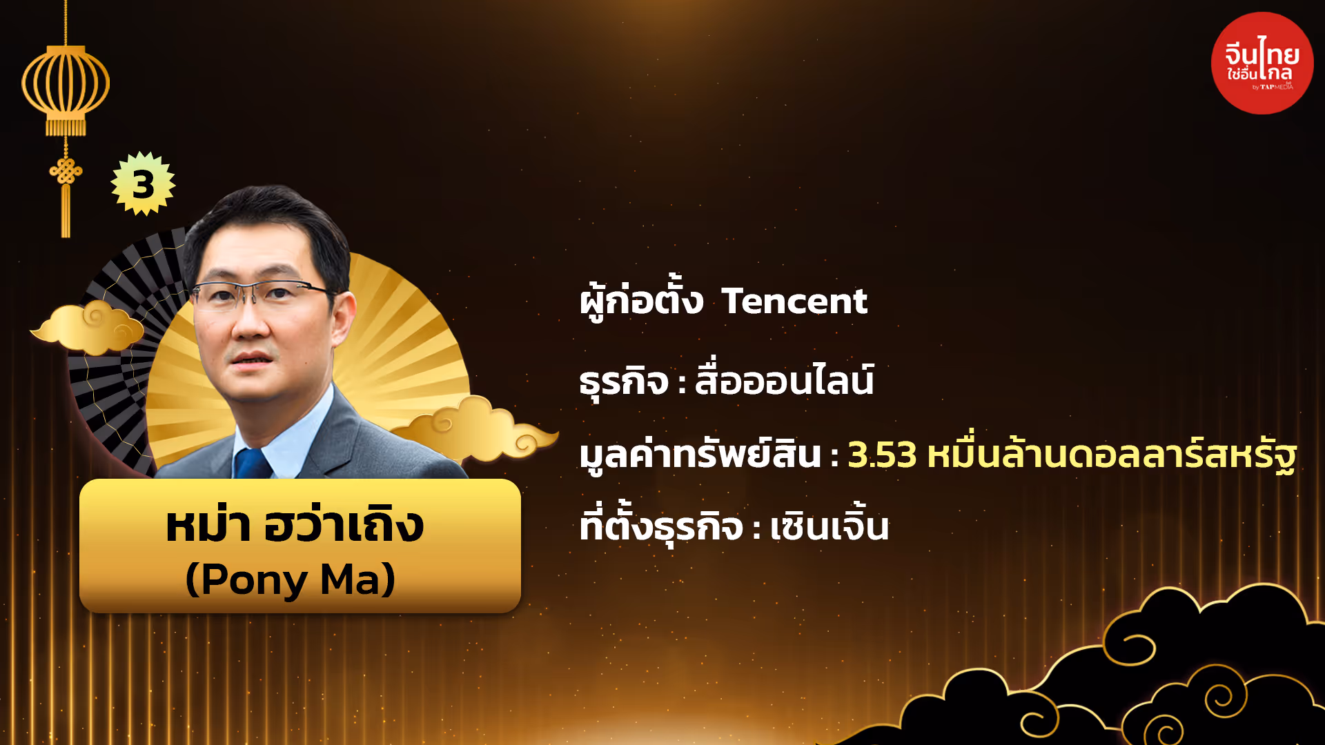ผู้ก่อตั้ง Tencent | ธุรกิจ: สื่อออนไลน์ | มูลค่าทรัพย์สิน 3.53 หมื่นล้านดอลลาร์สหรัฐ