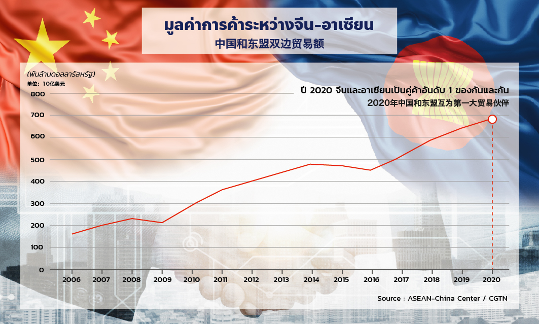 จีนเป็นคู่ค้าอันดับ 1 ของอาเซียนตั้งแต่ปี 2552 จนถึงปัจจุบัน ขณะที่อาเซียนได้กลายเป็นคู่ค้ารายใหญ่ที่สุดของจีนในปี 2563