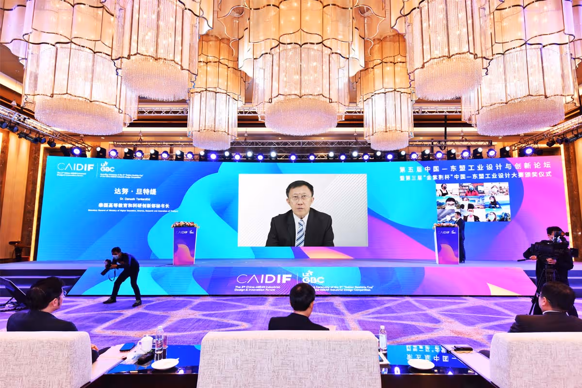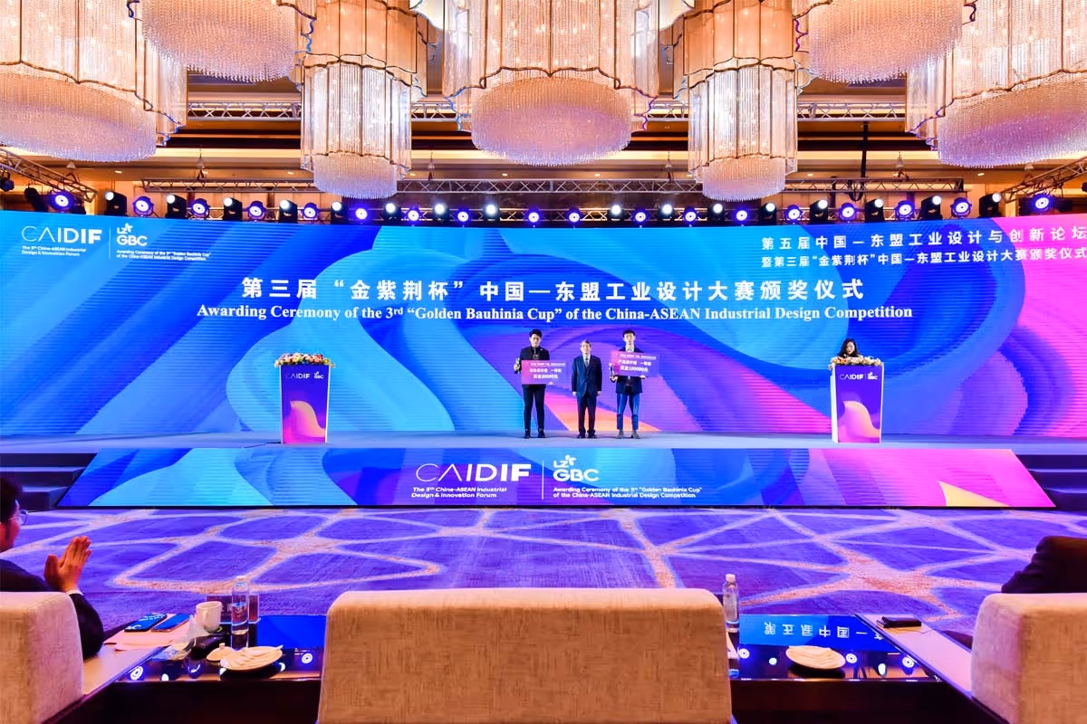 การประชุม China-ASEAN Industrial Design & Innovation Forum (CAIDIF) ครั้งที่ 5 และพิธีมอบรางวัลการประกวดงานออกแบบอุตสาหกรรมจีน-อาเซียน ชิงถ้วยรางวัล ‘Golden Bauhinia Cup’ ครั้งที่ 3 จัดขึ้นเมื่อวันที่ 8 ธ.ค.2565 ณ เมืองหลิ่วโจว เขตปกครองตนเองกว่างซีจ้วง ภายใต้หัวข้อหลักว่าด้วย “นวัตกรรมการออกแบบและความร่วมมือระดับภูมิภาคในยุค RCEP” ตัวแทนหน่วยงานภาครัฐจากประเทศต่างๆ อาทิ จีน อินโดนีเซีย เมียนมา สิงคโปร์ ไทย เวียดนามและเกาหลีใต้ ตัวแทนภาคธุรกิจ สถาบันการออกแบบ ดีไซเนอร์จากแวดวงการออกแบบอุตสาหกรรมและตัวแทนสื่อมวลชนต่าง ๆ เข้าร่วมงานครั้งนี้ผ่านทั้งช่องทางออนไลน์และออฟไลน์