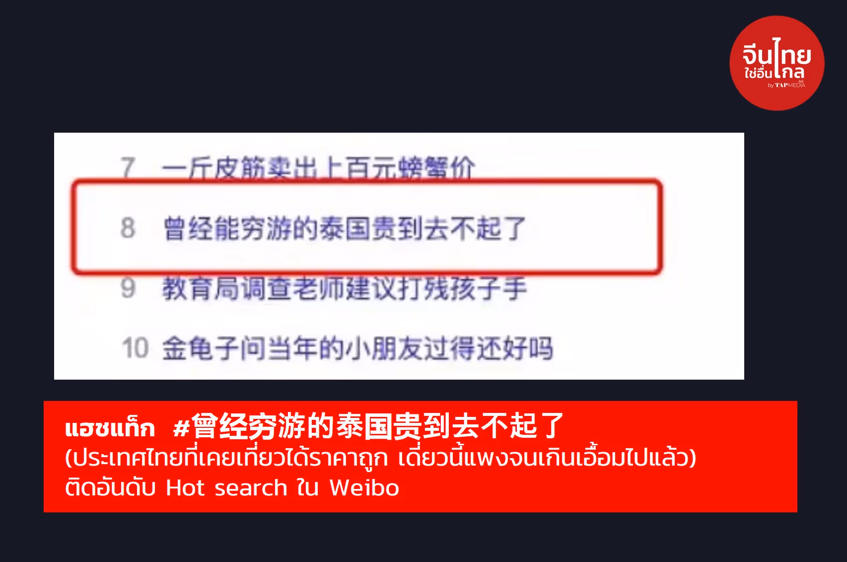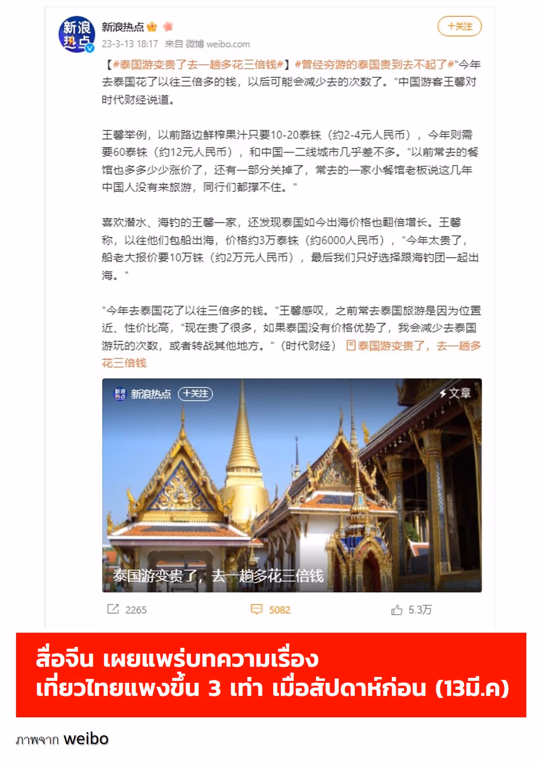 จนทำให้แฮชแท็ก #曾经穷游的泰国贵到去不起了(ประเทศไทยที่เคยเที่ยวได้ราคาถูก เดี่ยวนี้แพงจนเกินเอื้อมไปแล้ว) ขึ้นฮอตเสิร์ชใน Weibo มียอดวิวแล้วกว่า 450 ล้านวิว และมีคนเข้ามาคอมเมนต์จำนวนมาก