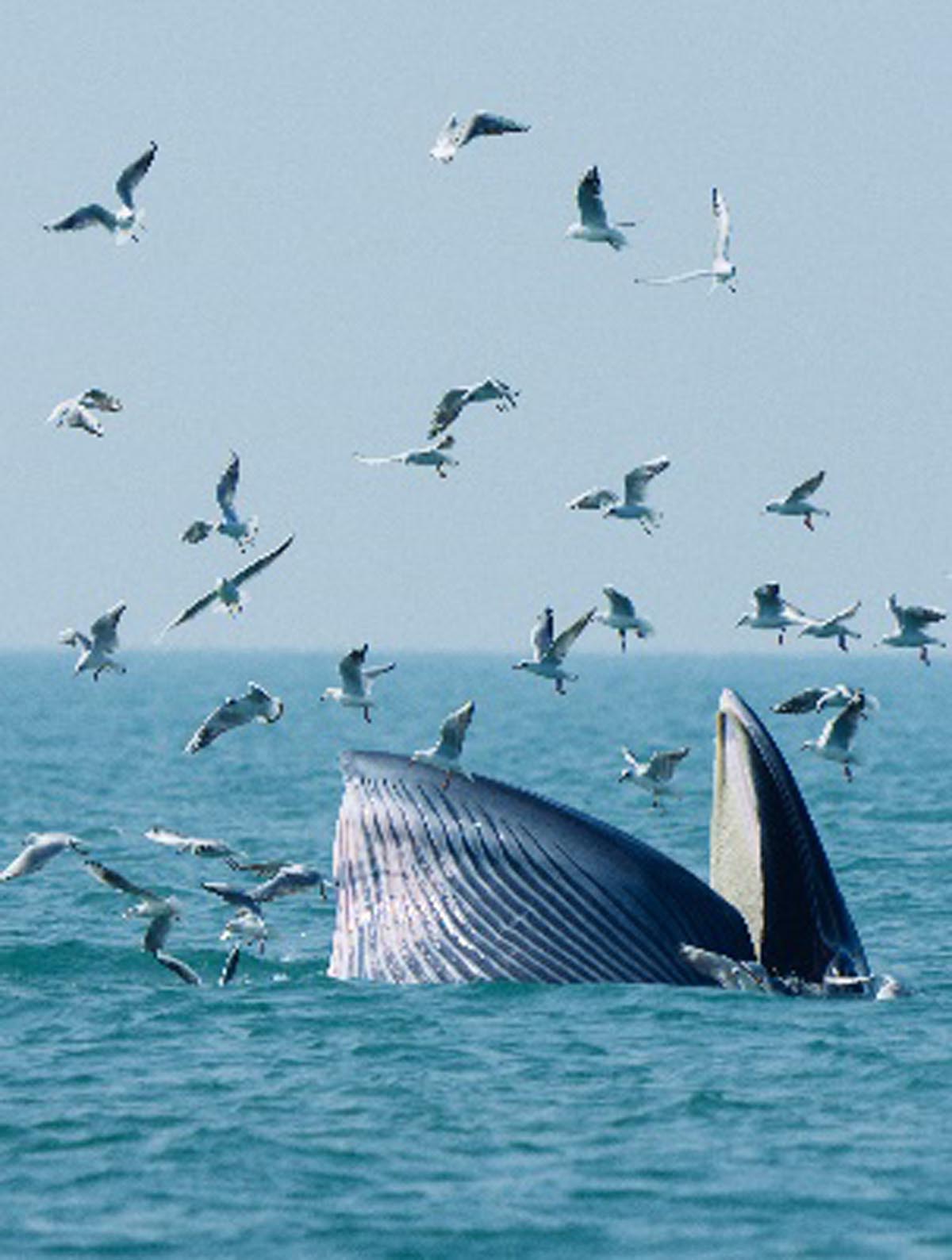 มาถึงเกาะเหวยโจวทั้งที อาจโชคดีมีโอกาสได้เห็นภาพการใช้ชีวิตอยู่ร่วมกันระหว่างฝูงวาฬกับนกนางนวลปากเหลือง (海鸥, Mew Gull) เมื่อมองไปยังผืนทะเลที่กว้างใหญ่ไร้ขอบเขต จะเห็นเหล่านกนางนวลกำลังบินโฉบไปมาตามเสียงการเคลื่อนไหวของฝูงวาฬอยู่ไกล ๆ บนผืนน้ำที่อยู่ห่างออกไป 400 เมตร วาฬบรูด้ากำลังไล่ต้อนเหยื่อ หลอกล่อให้เหยื่อมาอยู่รวมกันด้วยปากที่เหมือนกับอวนขนาดยักษ์ของมัน